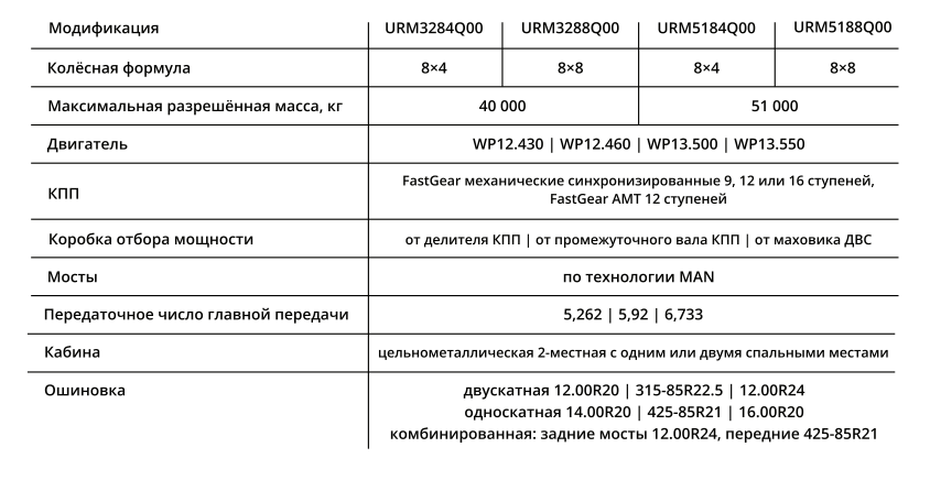 Шасси высокой грузоподъемности повышенной проходимости предназначено для постройки тяжелой специальной техники (буровые, крановые, тампонажные, цементировочные установки, цистерны большой емкости и пр.) для работы на нефтегазовых месторождениях и строительных объектах повышенной сложности. Наличие межколесных и межосевых блокировок, а также возможность эксплуатации на односкатной ошиновке обеспечивают работоспособность в условиях бездорожья.
