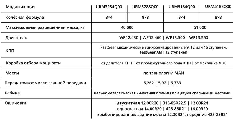 Шасси высокой грузоподъемности повышенной проходимости предназначено для постройки тяжелой специальной техники (буровые, крановые, тампонажные, цементировочные установки, цистерны большой емкости и пр.) для работы на нефтегазовых месторождениях и строительных объектах повышенной сложности. Наличие межколесных и межосевых блокировок, а также возможность эксплуатации на односкатной ошиновке обеспечивают работоспособность в условиях бездорожья.